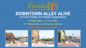 Downtown Alley Alive is a free, all ages pilot alley activation event in the Old Market on Friday, May 1 from 5 to 9 PM. Enjoy live music, live art, food and drink offers, and First Friday Art Walk energy in the 11th Street alley between Howard and Jackson.